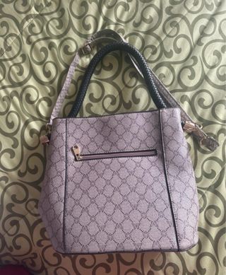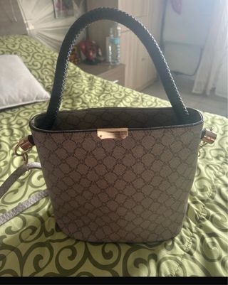 Elegante borsa a secchiello con un motivo geometrico distintivo. Dotata di manico intrecciato e tracolla regolabile. - Dettagli metallici dorati. - Finitura interna in contrasto.