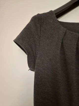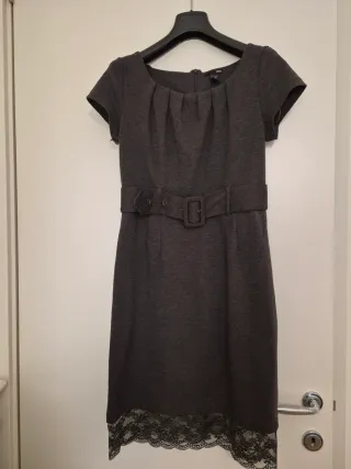 Elegante vestito grigio con dettagli raffinati. - Scollo rotondo con pieghe. - Cintura in vita con fibbia. - Fondo con bordo in pizzo nero.