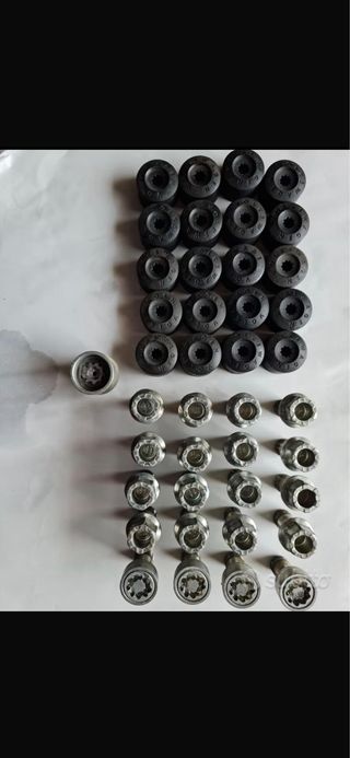 Set di bulloni per Volkswagen Golf composto da: -20 bulloni ruota di cui 4 antifurto -20 copribulloni neri -chiave bulloni antifurto -chiave estrazione tappo ruota Tutto originale e in perfette condizioni
