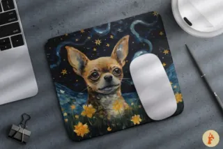 Tappetino per mouse con un'affascinante stampa di un chihuahua tra fiori gialli sotto un cielo notturno stellato. - Design artistico ispirato alla notte stellata. - Motivo floreale con fiori gialli. - Immagine di un chihuahua.