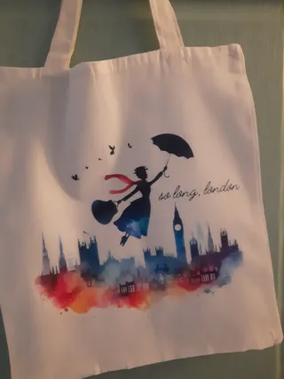 Borsa in tela con una stampa ispirata a Mary Poppins e allo skyline di Londra. - Stampa So Long, London con Mary Poppins che vola. - Dettagli colorati dello skyline di Londra. - Manici resistenti.