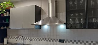 Cucina componibile in buone condizioni, con finiture in argento e bianco. .