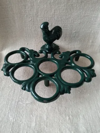 Elegante porta uova in ghisa smaltata, con un delizioso gallo decorativo in cima. Perfetto per dare un tocco rustico alla tua cucina o tavola. - Materiale: Ghisa smaltata - Design: Decorazione a forma di gallo - Colore: Verde scuro Sono presenti alcune sbeccature (evidenziate in foto dalla punta della penna ) che nulla tolgono alla bellezza dell'oggetto. Visualizzare bene le fotografie per verificare lo stato di conservazione e le misure