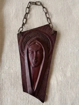 Scultura da parete raffigurante una Madonnina, realizzata in legno o forse ceramica verniciata . - Finitura scura e dettagli intagliati. - Decorazione con catena per appenderla. Vintage, anni '50/'60 ma ancora in buone condizioni. Visualizzare bene le fotografie per verificare lo stato di conservazione e le misure.
