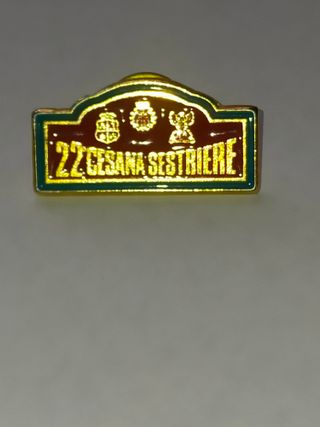 Spilla commemorativa della 22a Cesana Sestriere, anno 2003. Un pezzo unico per collezionisti. - Design con stemma e trofeo. - Colore oro e bordeaux.