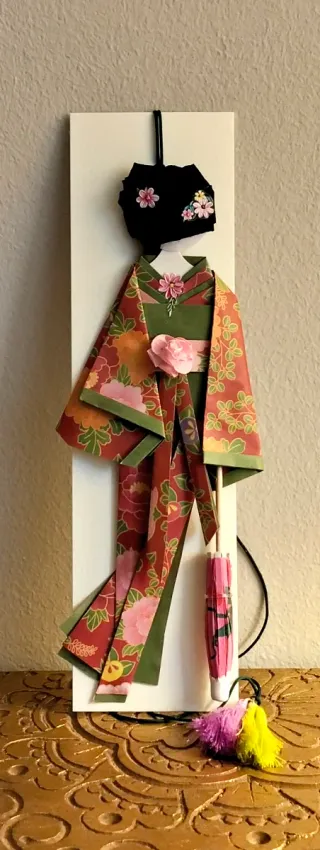 Delizioso set di due segnalibri con bambolina geisha realizzata con carta origami, perfetti per portare un tocco di fortuna e bellezza ai tuoi libri. - Design ispirato alle tradizionali bambole giapponesi. - Realizzati con carta decorata con motivi floreali. - Ogni geisha tiene un piccolo ombrellino o altro accessorio - Include nappe decorative colorate. - Confezionato in sacchettino di cellophane