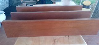 mensole in legno color noce, tamburate, artigianali anni '80. due finite in testa la terza grezza. Fori per perni di sostegno a 72/73 cm circa.