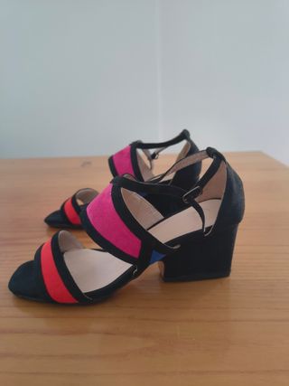 Sandali con tacco a blocco, comodi ed eleganti. Perfetti per l'estate! Sono in pelle scamosciata nera con dettagli rosa e blu. - Sono taglia 39. - Il paio di sandali è in ottime condizioni.