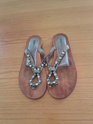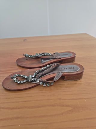 Sandali infradito Positano, realizzati in pelle e cuoio. Sono un paio di infradito eleganti e raffinate. - Tomaia in pelle color argento. - Dettagli in cuoio color marrone. - Applicazione di strass scintillanti.