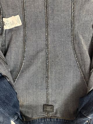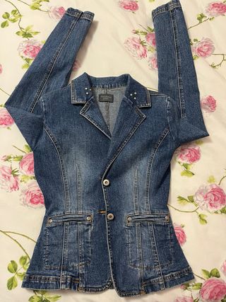 Giacca in denim da donna, un capo versatile e alla moda. - Design classico con chiusura a bottoni. - Dettagli con borchie sul colletto. - Tasche frontali applicate. jeans un po’ elasticizzato
