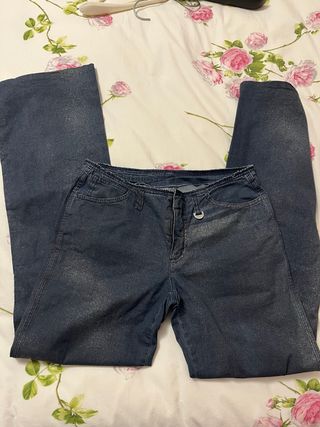 Pantaloni da donna in tessuto colore blu con un particolare effetto glitterato. leggero, 98% cotone 2% elastico