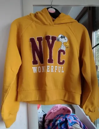 Felpa gialla senape con cappuccio, tema Peanuts. - Stampa NYC WONDERFUL sul davanti, rilievo morbido - Personaggio Snoopy - Maniche lunghe Pari al nuovo, taglia 10-11 anni