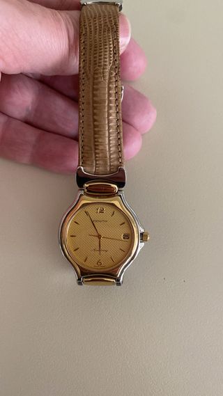 Elegante orologio Zenith Academy con cassa bicolore oro e acciaio. - Quadrante color oro con finitura testurizzata. - Indici applicati e numeri romani. - Datario a ore 3. - Movimento Swiss Made.