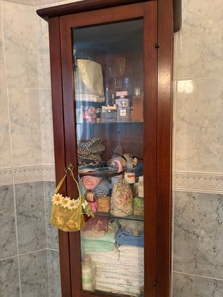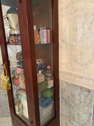 Elegante cristalliera in legno scuro, perfetta per esporre oggetti. - Struttura in legno con ante in vetro. - Ripiani interni per organizzazione.