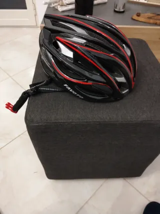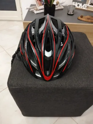 Casco da ciclismo nero con dettagli rossi, taglia M. Ideale per la sicurezza su due ruote. - Design aerodinamico. - Sistema di ventilazione. - Cinturino regolabile.