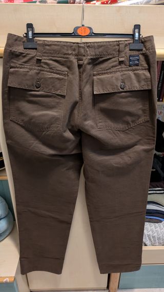 Vendo un paio di pantaloni color marrone scuro di marca Mason's. Taglia: 52 Materiale: 100% cotone L'oggetto è in ottime condizioni, indossato poche volte. Disponibile per qualsiasi domanda o foto aggiuntive e a spedire a carico dell'acquirente.