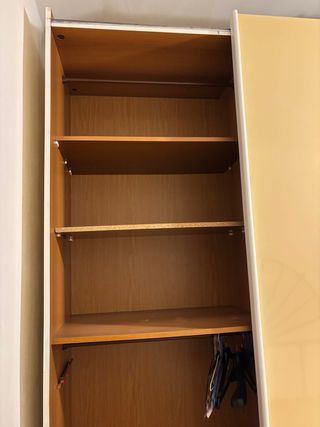 Armadio con ante scorrevoli, perfetto per organizzare i tuoi spazi. - Dimensioni: 2,50 metri di larghezza, 6 metri di profondità e 2,30 metri di altezza. - Struttura in legno con finiture gialle e marroni.
