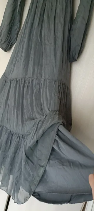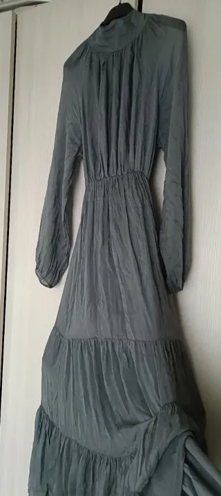 Elegante abito lungo Dixie in cotone, perfetto per ogni occasione. Lunghezza 125cm - Colore verde oliva. - Taglia unica versatile. - Dettagli sul collo e sulle maniche. Prezzo del cartellino 179 euro