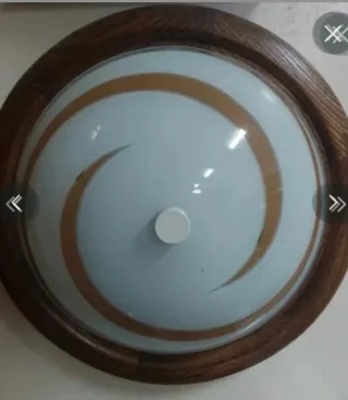 Plafoniera dal design moderno con finiture in legno e dettagli in vetro. - Cornice esterna in legno scuro. - Diffusore in vetro con decorazioni a spirale. - Elemento centrale in rilievo. Diametro totale 28 cm