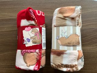 Set di due plaid in pile, perfetti per aggiungere un tocco di calore e stile alla tua casa. Le dimensioni sono 130x150 cm ciascuno. - Design con orsetti e cuori - Motivo a righe con coniglietto e farfalla