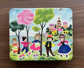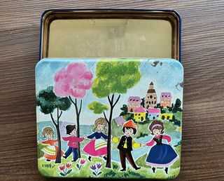Bellissima scatola di latta vintage Venchi con una vivace illustrazione di bambini che danzano in un paesaggio campestre. - Design colorato con bambini in abiti tradizionali. - Scena con alberi, fiori e un villaggio sullo sfondo. - Ideale per collezionisti o come contenitore decorativo.