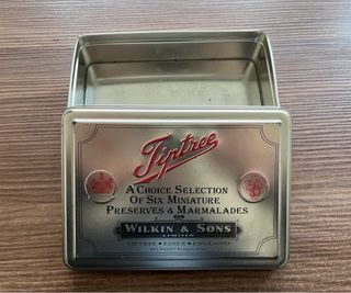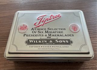 Scatola in latta vintage di Wilkin & Sons, con il logo Tiptree. - A Choice Selection Of Six Miniature Preserves & Marmalades - Wilkin & Sons Limited - Tiptree, Essex, England - Peso netto: 250g / 9oz
