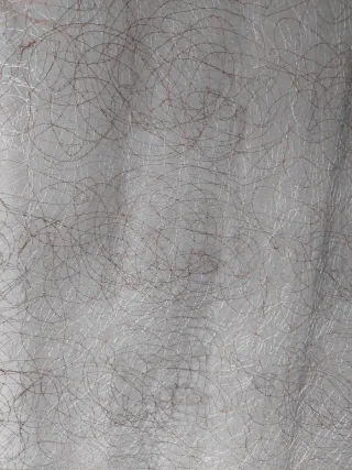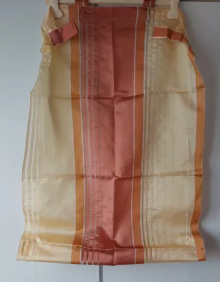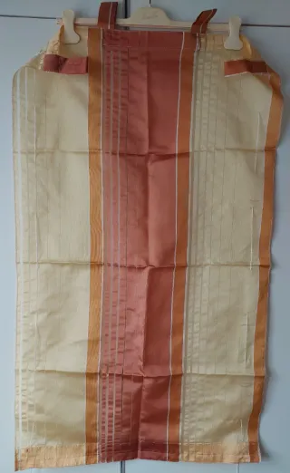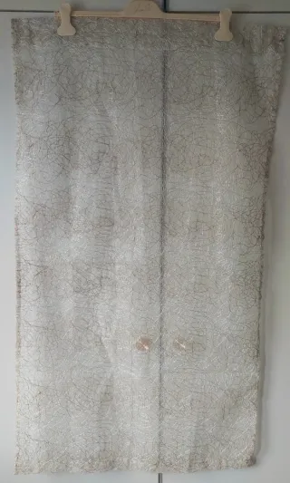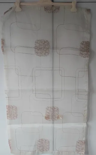 Tenda a vetro con un design elegante e luminoso. Come nuova, dimensioni: cm. 114 x 65. Si può mettere a pannello con la bacchetta dalla parte del bordo più basso oppure con arricciatura con la bacchetta nel bordo più alto. - Tessuto leggero con fili lurex dorati. - Motivo a fili intrecciati.