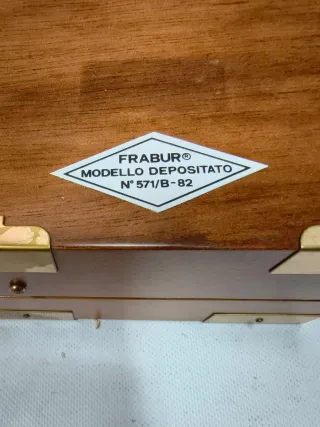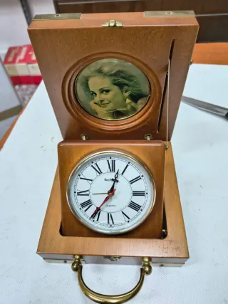 Elegante orologio da tavolo Frabur con cornice portafoto integrata. Un pezzo unico che unisce la funzionalità di un orologio al valore affettivo di una foto. - Materiale: Legno massello - Design classico con numeri romani - Cornice circolare per foto Modello depositato come da targa. Orologio funzionante, il cicalino della sveglia, a volte, non parte. Il gancio della chiusura è rotto. Qualche alterazione dei particolari in ottone, dovuti al passare del tempo. Dimensioni chiuso 14×14×7 Aperto altezza 17 cm