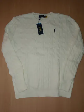 Felpa Ralph Lauren bianca con trama a trecce. - Taglia XL - Logo a cavallino ricamato sul petto