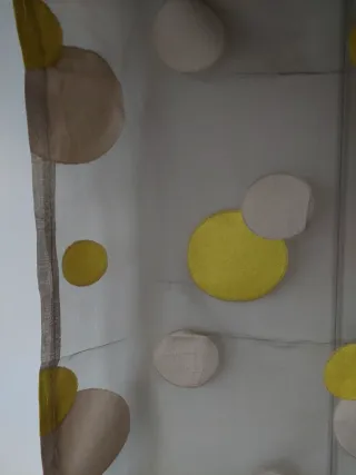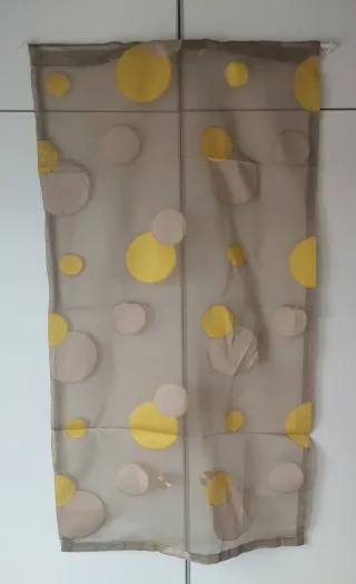 Tenda a vetro per finestra con stampa a grossi pois gialli e beige su fondo tortora. Tessuto firmato Marta Marzotto. Confezionata su misura. Misure: cm. 112 x 60 - Disegno con cerchi gialli e beige. - Tessuto leggero e trasparente.