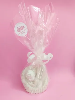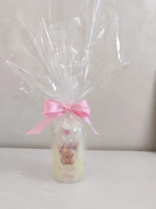 Candela artigianale decorata con una tenera orsetta, perfetta per celebrare la nascita di una bimba. Un ricordo speciale e personalizzato.