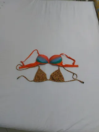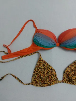Set di due bikini da donna. Triangolo con fantasia leopardata, marca CALZEDONIA. Reggiseno imbottito con colori sfumati arancione, azzurro e verde. Entrambi taglia 42 (M). #setbikini #bikini #bikiniset #costumedonna #costumemare #donna #costumedabagnodonna