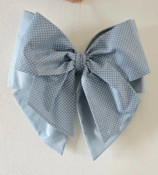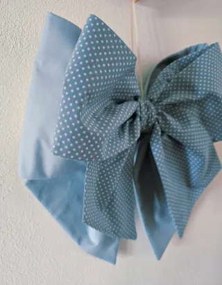 Fiocco nascita in tessuto azzurro con pois bianchi. - Fantasia a pois. - Colore azzurro e bianco. Misure come da foto. Compreso nel prezzo, posso aggiungere orsetto, o cuore, o nuvoletta e nome bimbo dipinta a mano.