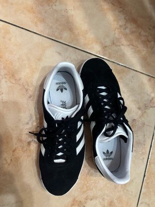 Scarpe da ginnastica Adidas modello Gazelle. Spedizione veloce , vendo per inutilizzo. - Tomaia in morbido camoscio nero. - Iconiche bande laterali bianche. - Suola in gomma bianca. - Dettagli interni con logo Adidas e tecnologia OrthoLite.