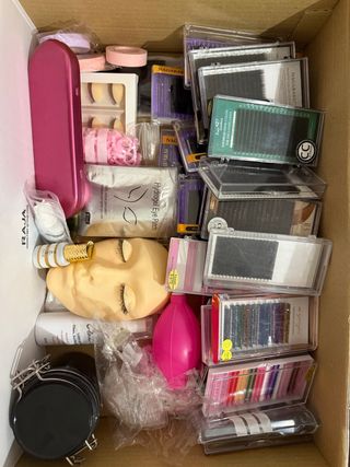 Kit per extension ciglia con vari tipi di ciglia. 29 scatole di ciglia di diverse misure 1 colla 1 primer 1 barottolino per conservare la colla 1 porta pinze 3 pinze con curvatura differente 1 faccia per esercitazioni 4 paia di occhi intercambiabili 1 sapone per ciglia Tape 1 pacco di patch occhi