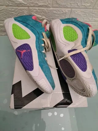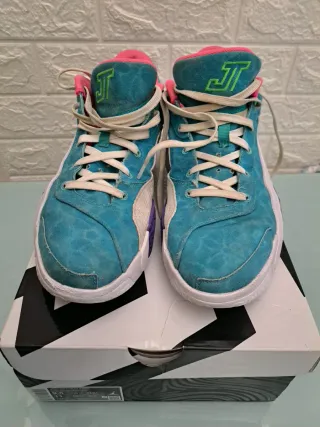Scarpe da ginnastica Jordan Tatum 2 con un design vivace. - Tomaia in tela blu con accenti rosa. - Logo JT verde sul colletto. - Lacci bianchi.