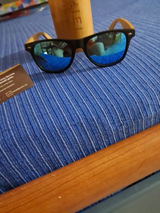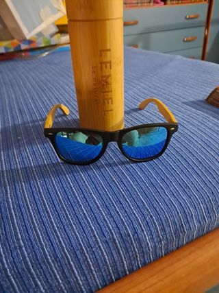Occhiali da sole in legno, dal design elegante e accattivante. Sono perfetti per aggiungere un tocco di stile al tuo look estivo. - Montatura in legno di bambù marrone chiaro. - Lenti blu a specchio.