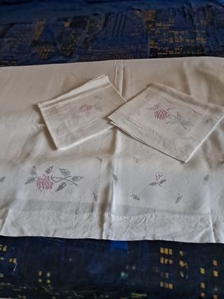 Bellissimo completo lenzuola matrimoniali in cotone bianco. Il set include un lenzuolo con angoli e due federe. Sono decorate con un ricamo floreale delicato, rose e foglie, di colore rosa e grigio chiaro. Perfette per una camera da letto elegante e raffinata.
