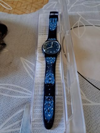 Orologio Swatch con cinturino fantasia. - Cinturino con motivo a maglia blu e bianco. - Cassa e fibbia nere.