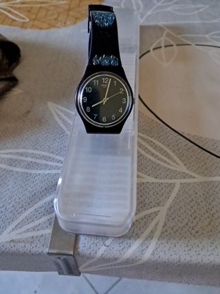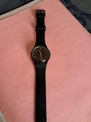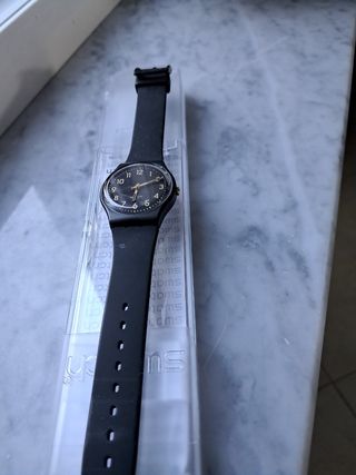Elegante orologio Swatch con cinturino nero. - Quadrante nero con numeri arabi. - Chiusura con fibbia.