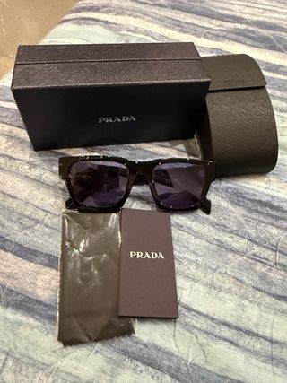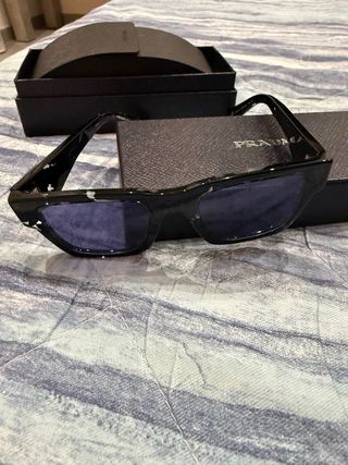 Occhiali da sole Prada neri, completi di scatola e custodia. - Logo Prada sulla scatola e sulla custodia. - Lenti scure. - Montatura nera.