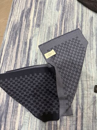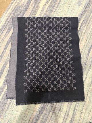Elegante sciarpa in lana con iconico motivo GG di Gucci. Un accessorio classico che aggiunge un tocco di lusso. - Motivo GG all-over. - Tonalità blu e grigio.