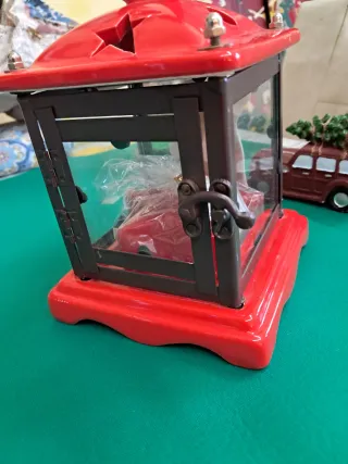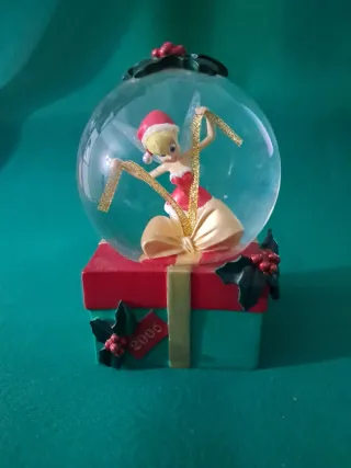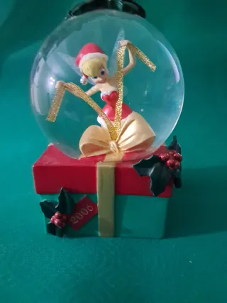 Deliziosa palla di neve a tema natalizio con Tinkerbell. - Personaggio di Tinkerbell vestita da Babbo Natale. - Base a forma di pacco regalo rosso e verde. - Decorazioni natalizie come agrifoglio e bacche. - Anno 2006 inciso su un'etichetta rossa.