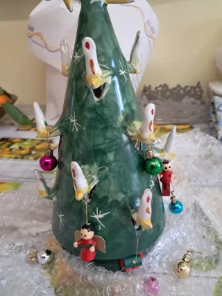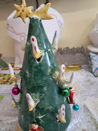 Albero di Natale in ceramica, un pezzo unico per le tue decorazioni. - Decorazioni colorate incluse. - Design a forma di albero stilizzato. - Finitura lucida.