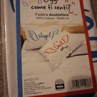 Set di due federe per cuscino con design doubleface. - Fantasia Angel & Devil. - Dimensioni: 50x80 cm. - Materiale: 100% Cotone.