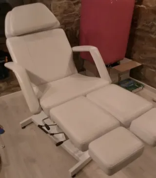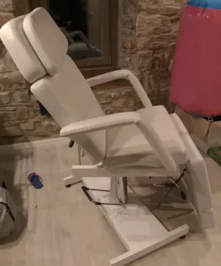 Poltrona da estetista in ecopelle bianca, ideale per trattamenti. - Seduta imbottita e confortevole. - Braccioli integrati. - Base stabile con ruote. - Poggiatesta regolabile.