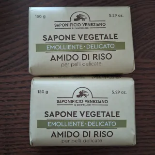 Due saponette vegetali Saponificio Veneziano. - Fragranza: Amido di Riso. - Tipo: Emolliente e Delicato. - Peso per saponetta: 150 g (5.29 oz). - Ideale per pelli delicate.