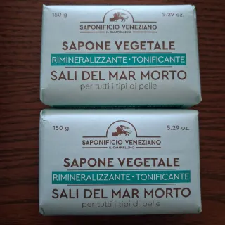 Due saponette vegetali Saponificio Veneziano, al sale del Mar Morto. - Formato da 150g ciascuna. - Tonificante e rimineralizzante. - Adatto a tutti i tipi di pelle.
