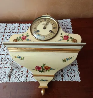 Orologio da mensola Sclenker vintage, funzionante. Presenta una decorazione floreale dipinta a mano su sfondo avorio. -Supporto/mensola da appendere alla parete se si vuole. - Cassa in metallo con finiture dorate. - Quadrante con numeri romani. - Decorazioni floreali dipinte a mano. -Movimento meccanico a carica manuale con chiavetta. -Con un dolce rintocco batte sia la mezz'ora che l'ora.... perfettamente funzionante!!