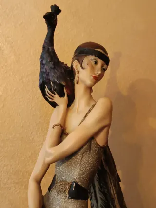 Splendida scultura da collezione Art Déco di G. Armani opera del 1987 Florence. Realizzata in resina di alta qualità colata a freddo spesso definita porcellana in stile Capodimonte dipinta a mano Raffigura una donna con un pavone. Una vera opera d 'arte curata in ogni minimo dettaglio!! - Dettagli in oro e nero. - Finitura lucida. In perfetto stato di conservazione, la scultura misura altezza cm 50.. diametro base cm 18....